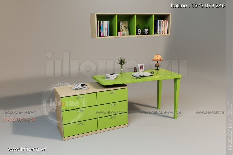 Sản phẩm này là sự ghép nối độc đáo giữa 1 bên là mặt bàn học, 1 bên là tủ đựng đồ 6 ngăn nhỏ gọn và xinh xắn, kết hợp thêm một kệ sách treo tường tạo nên sự đồng bộ và thống nhất. Với cách thiết kế và bài trí khoa học, các kiến trúc sư đã tạo nên bộ bàn học 09 có đầy đủ các công năng để phục vụ nhu cầu sử dụng của các bé, đồng thời mang lại nét thẩm mỹ và sự tươi mới, sinh động cho không gian phòng.