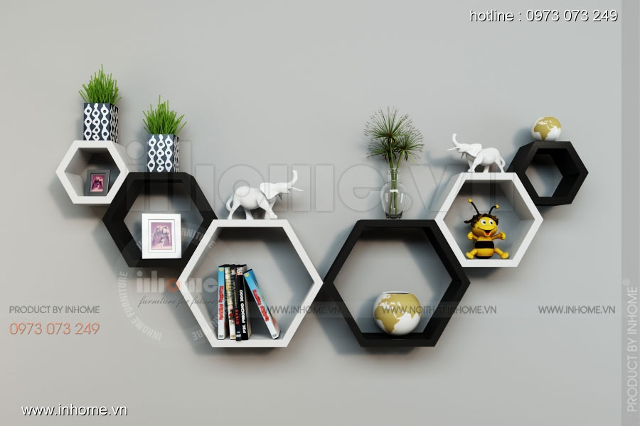 Với mẫu giá trang trí 01, các khối lục giác trắng đen có kích thước khác nhau được bài trí liền kề, nối tiếp một cách tài tình. Người sử dụng hoàn toàn có thể bày biện sách báo, tranh ảnh hay những vật dụng trang trí nhỏ xinh để tạo sự tươi mới, sinh động cho căn phòng, đồng thời mang lại sự tiện nghi trong sinh hoạt cho mọi người.