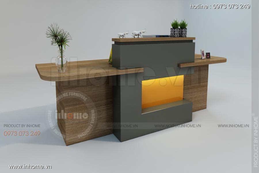 Quầy lễ tân 03 là một trong những thiết kế điển hình của Inhome nhằm mang đến cho khu vực này 1 sản phẩm đầy sáng tạo, độc đáo mà không kém phần năng động, tiện ích. Trong mẫu thiết kế này, quầy lễ tân được cách điệu bởi 1 khối trang trí lớn có màu sắc phối kết hợp rất ăn nhập, tạo sự chú ý và lôi cuốn.