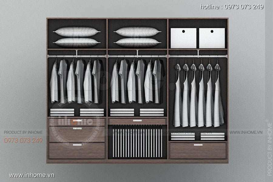 Bên trong tủ bao gồm nhiều ngăn treo, ngăn kéo, kệ để treo giữ quần áo hay các vật dụng cần thiết trong gia đình. Với cách bài trí của Inhome, khách hàng khi sử dụng sản phẩm sẽ cảm thấy ưng ý và hài lòng.
